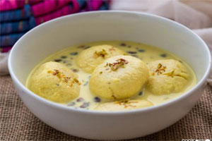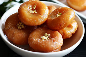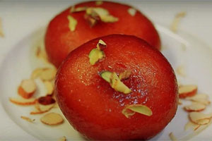Take a mixing bowl and mash mawa to a smooth texture. Then add milk powder, all purpose flour and arrowroot powder. Mix everything to get a very smooth dough and make them into 1 ½ to 2” size balls. Take a ball and make a dent in the center. Put some chopped dry fruits or whole fruits like cashew, badam, almond, raisin in the center. Next close the opening and smooth it all over to look like a round ball making sure that there is no crack in the ball. Keep it in a plate and repeat the process for the remaining balls. By the time the ghee must be hot enough to deep fry the stuffed balls and fry till golden brown from all round by stirring in between slowly. Take out from ghee and put it in the warm sugar syrup and allow to soak for 12 – 15 minutes. Serve by sprinkling some chopped dry fruits.