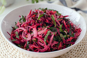 Slice the cooked beets, sprinkle with oil and vinegar and mix well.