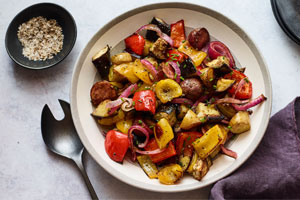 Wash the egg plant and cut in to slices Add salt and let stand until soft.Drain the egg plant .sprinkle each slice with flour and fry on bothsides in a Nutricook cookware Mix with tomatoes , olives and cut sausage , season to taste.