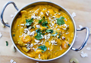 Grind the wet masalas and dry masalas separately. Chop finely all the fruits in the ingredients. Preheat Nutricook 24 cm pot and grease the pot with 1 tsp of oil and roast the cashews and keep it aside. To the same pot add wet masala and fry for 2 minutes. Then add the dry masalas and fry for 2 more minutes. Add the carrots and peas, mix together curd and cream and add to the gravy. Allow to thicken a bit and fruits, cashew and raisins and boil till the gravy is thick and the fat separates. Garnish with grated cheese, coriander and chopped cherries. Serve hot with naan, roti or paratha.