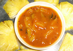 Dry fry without oil for 5 minutes sesame, urad dal, channa dal, red chilli and asafetida till they are all roasted properly in Nutricook 16 cm pot. Grind in mixer grinder the fried ingredients with green chillies, chick peas, tamrind paste, jaggery and grated coconut with little water in to a smooth paste. Preheat Nutricook 20 cm on medium flame and put mustard seeds and allow to pop. Then put the crushed pineapple to it and cook the pineapple for about 10 minutes approximately. Later on, add the grounded paste to the cooked pineapple and add salt to taste. Close the unit and cook for further 5 minutes and put off the flame. This goes well as a side dish with chapati or rice with rasam. Serve it hot or cold.