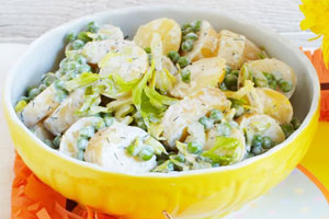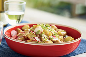 Mix the ricotta cheese with milk . Add cut radishes and spring onions . Cook the potatoes without peeling in a Nutricook following the instructions for cooking without water. Serve as an accompaniment to the ricotta cheese.