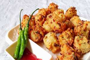 Take a suitable bowl and add 200 gm of rava, mix it with 4 tsp of curd. Add 1 tsp of ginger garlic paste and ¼ spoon of jeera powder. Add salt to taste and mix well. Add ¼ tsp of chilli powder and a pinch of baking soda. Add little water and mix well and keep aside for 10 minutes. Later add curry leaves, coriander leaves, chopped green chillies, chopped onions and mix well and ready for deep frying.
