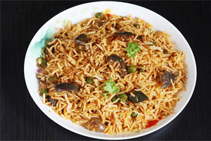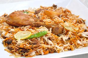 Marinate the chicken with ginger, garlic, coriander, green chilli, tomato pastes and chilli powder, turmeric powder, garam masala powder, salt and curd. Keep it aside for ½ hour. Half cook the rice in 20 cm high and sprinkle the colour. Preheat the 24cm roaster up to the blue end mark and fry the half quantity onions and all the potatoes till golden brown colour and keep aside. Fry the remaining onions in the same unit till golden brown colour and put the marinated chicken and cook till steam comes and chicken becomes tender.