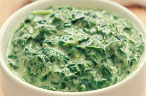 Clean and wash the spinach. Cook for 10 minutes in a Nutricook pot following the cooking instructions. Cool the cooked spinach and chip in a food processor. Mix flour with cream. Add crushed garlic. Pour the sauce over he spinach cook a while longer. Turn off the heat and leave to stand for 5 minutes in the warm pot. Season to taste.